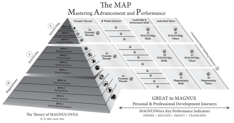 The MAP is built on three foundational pillars—MAGNANIMITY, Attaining MAGNUSITY, and Practicing MAGNUSHIP—which work together to create a unified leadership approach. These pillars are supported by the 11 Rings of Human Performance and Dynamic Threads, offering a multidimensional framework for personal and professional transformation.